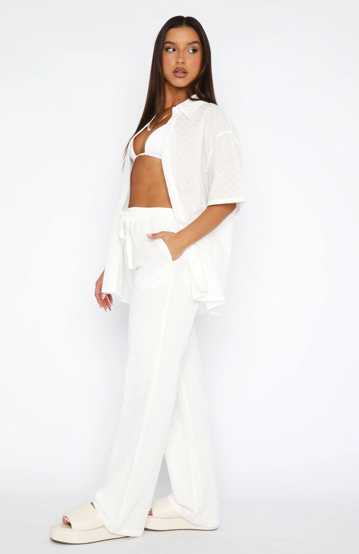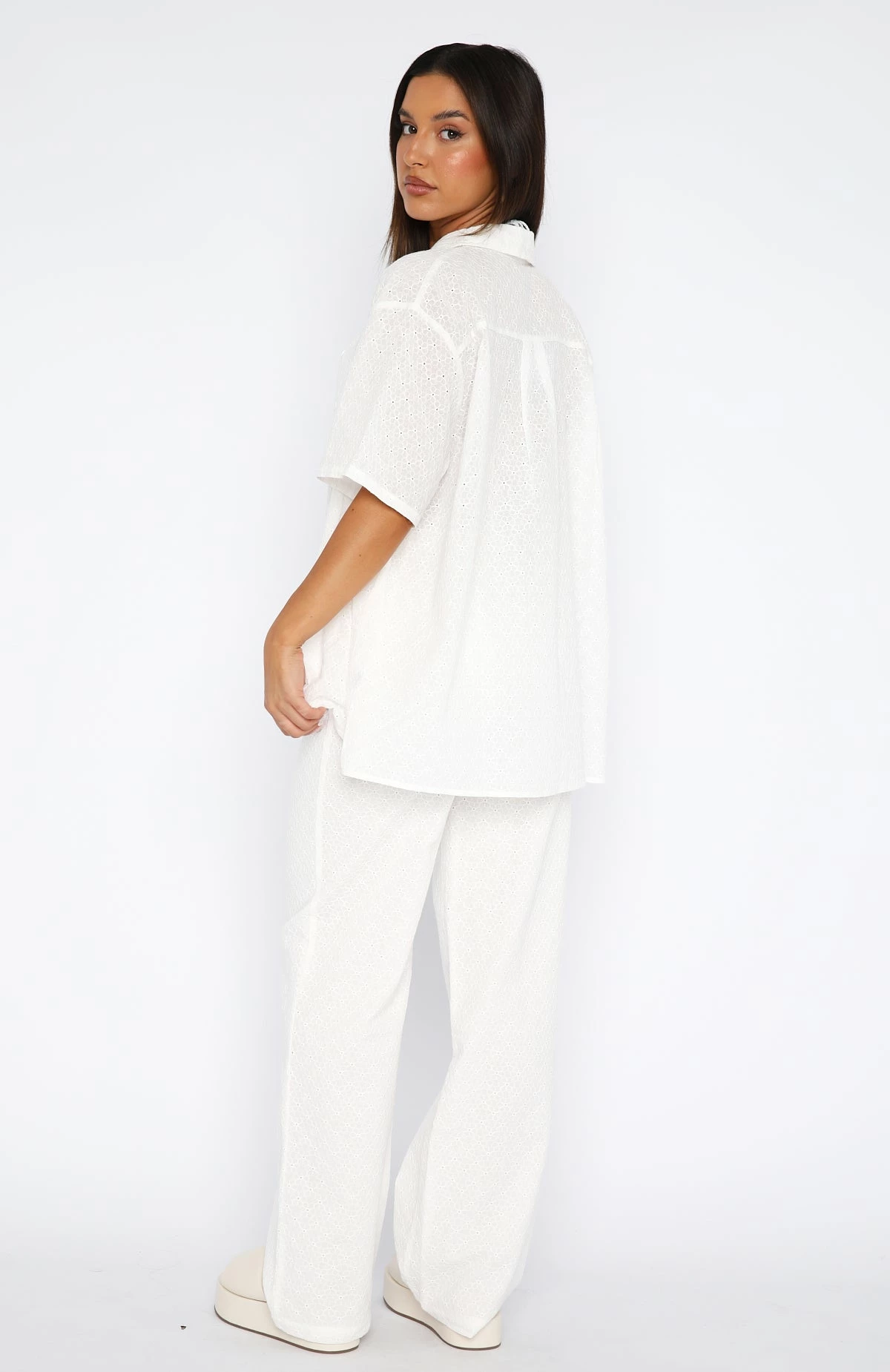 The Own The Show Pants in White is a weekend staple! Features a high elasticated drawstring waistband, elasticated ankles, side pockets and lined, broderie anglaise fabric. Complete the set with the matching Only Yours Shirt White and platform slides for the perfect weekend fit!