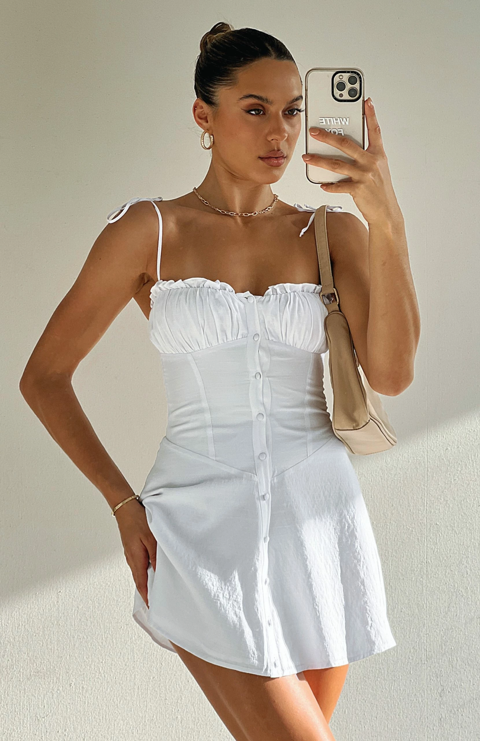 You will be the moment in the Plastic Heart Mini Dress in White. Featuring thin straps, button front closure and lined, fabric. We love this paired with gold accessories and perspex heels and you are ready to hit the town with the girls!