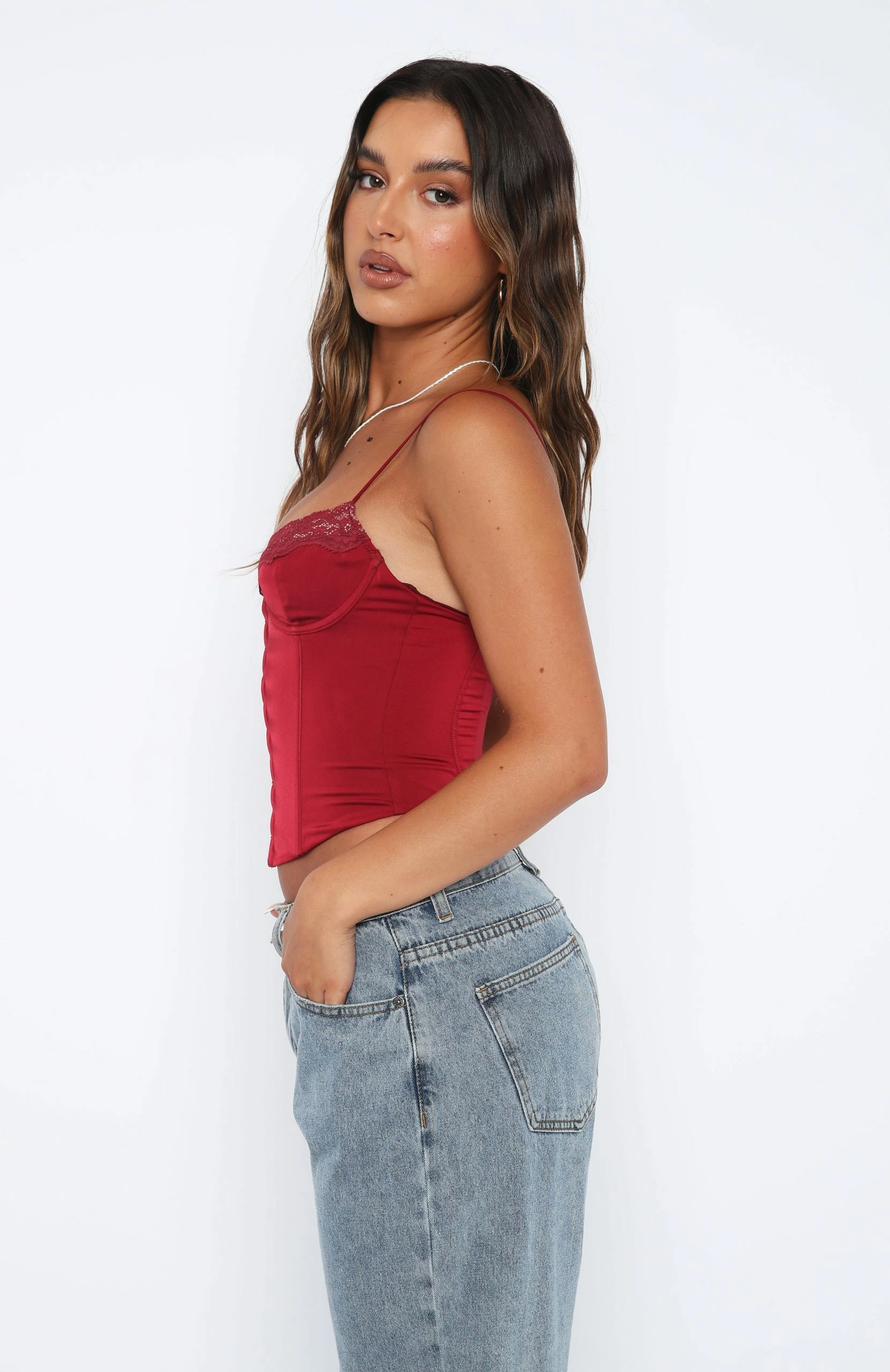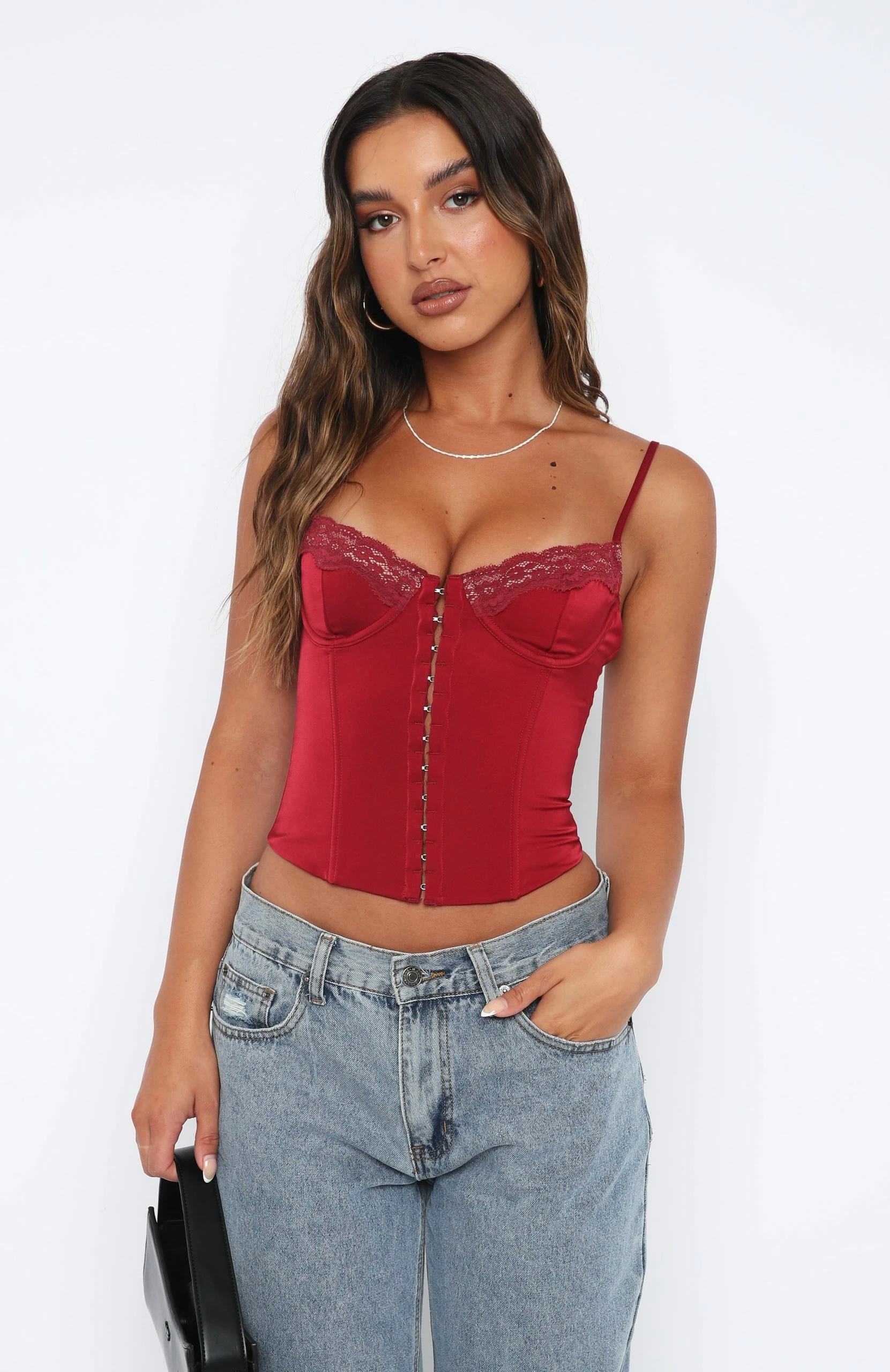 The Pour It Up Bustier in Wine is giving us major character energy! Featuring thin, adjustable straps, lace trim, bust underwire, front eyelet closure, boning in bodice, zipper centre back and mesh lining and silk-feel fabric. Pair with your favourite White Fox Denim Jeans and gold accessories for a look we love!