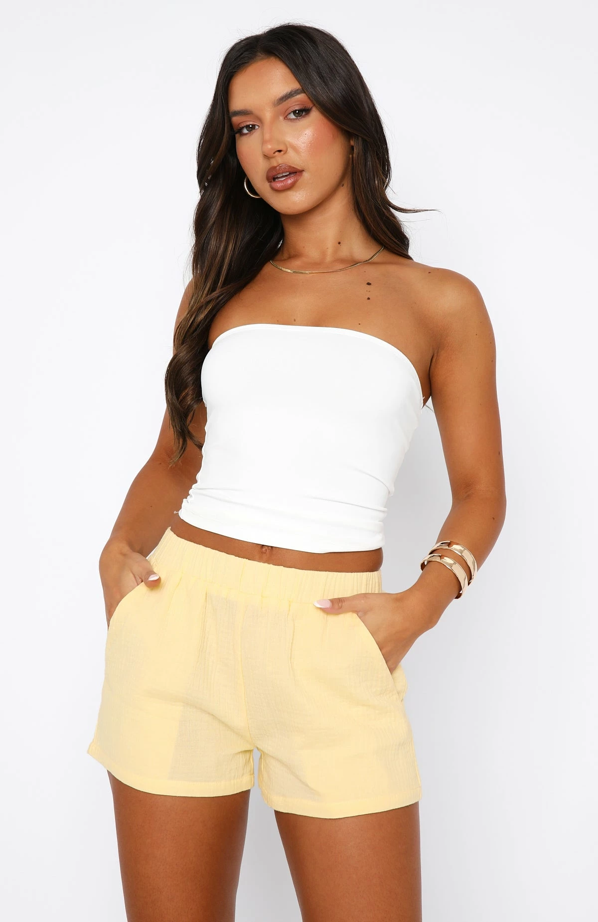 A summer short best styled with a backless bodysuit, or dressed down with denim for a polished off-duty look. The Put The Pressure On Shorts Butter features an elasticated high waistband, side pockets and lined, lightweight fabric. We love this paired with the a button-up shirt and platform slides for the perfect weekend fit!