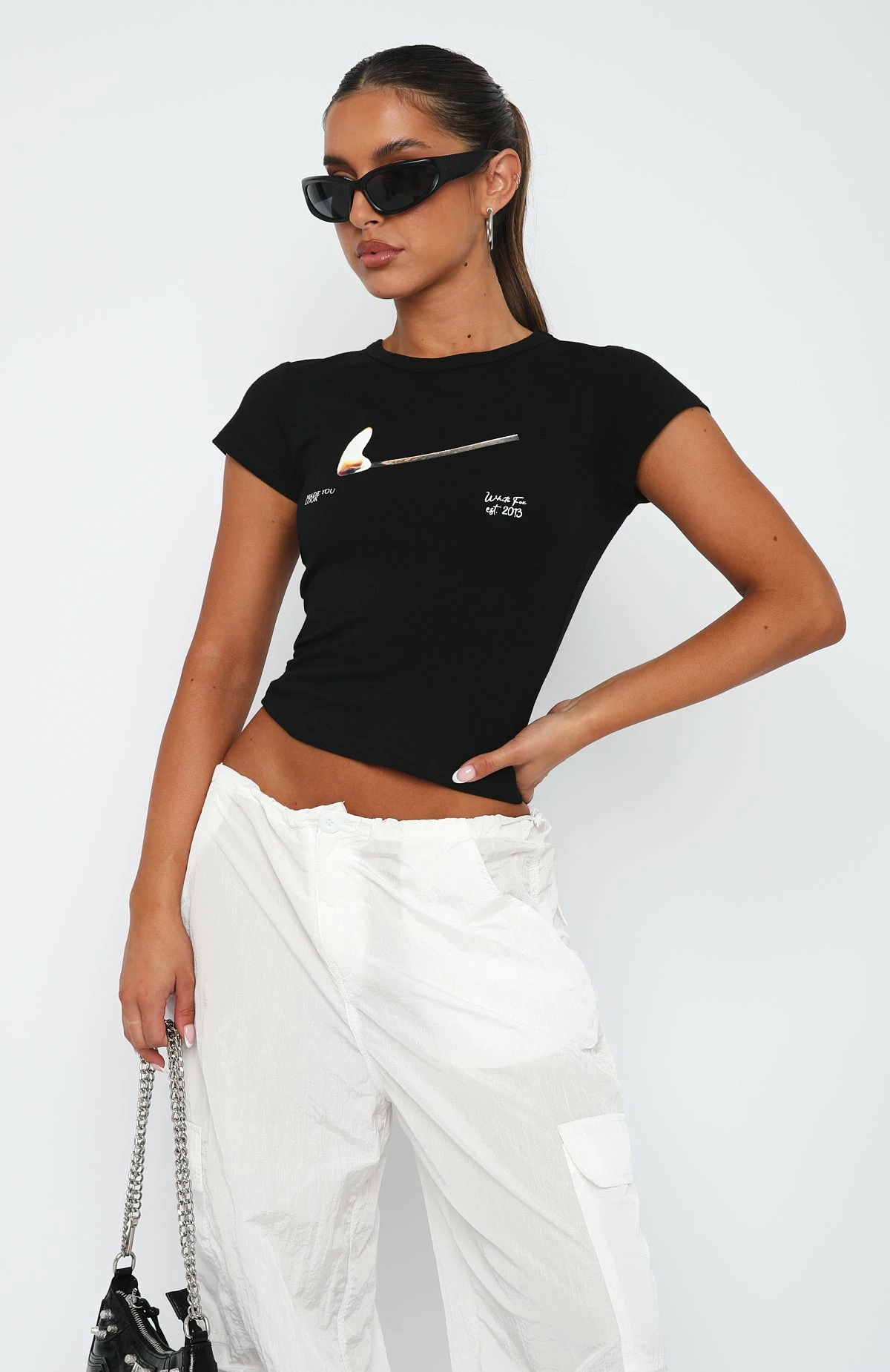 Channel everyday street style in the Running On Flames Baby Tee in Black. Featuring short sleeves, high scooped neckline, printed logo centre front and soft stretch fabric. We love this paired with cargo pants and sneakers for a cool girl fit!