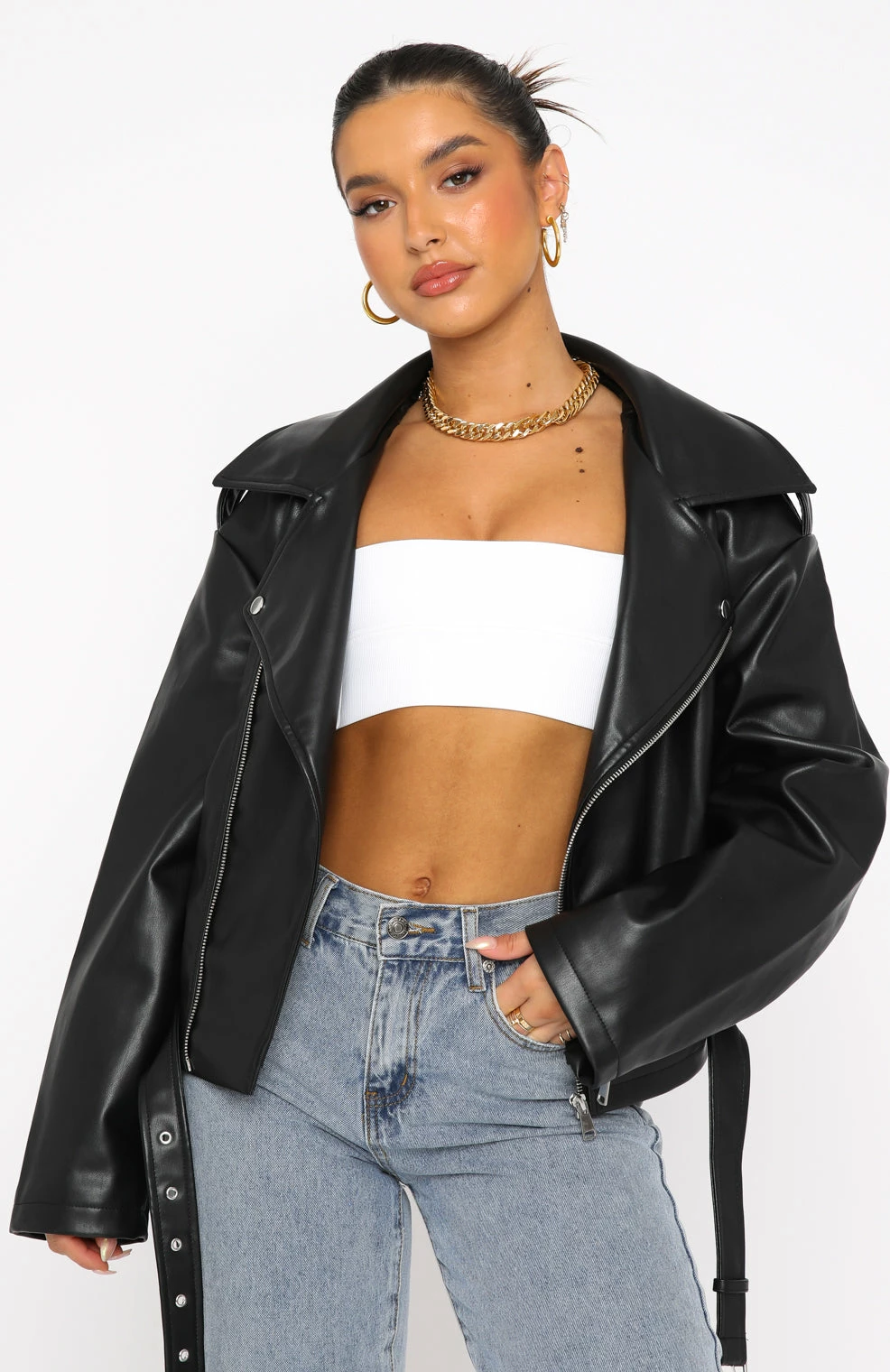 Upgrade your outerwear wardrobe with the Seal The Deal PU Biker Jacket in Black. Featuring long sleeves, front zipper closure, lapel collar, front pockets, removable buckle belt and PU fabric. We love this paired with your favourite pair of White Fox Denim Jeans and gold accessories for the perfect cool girl fit!