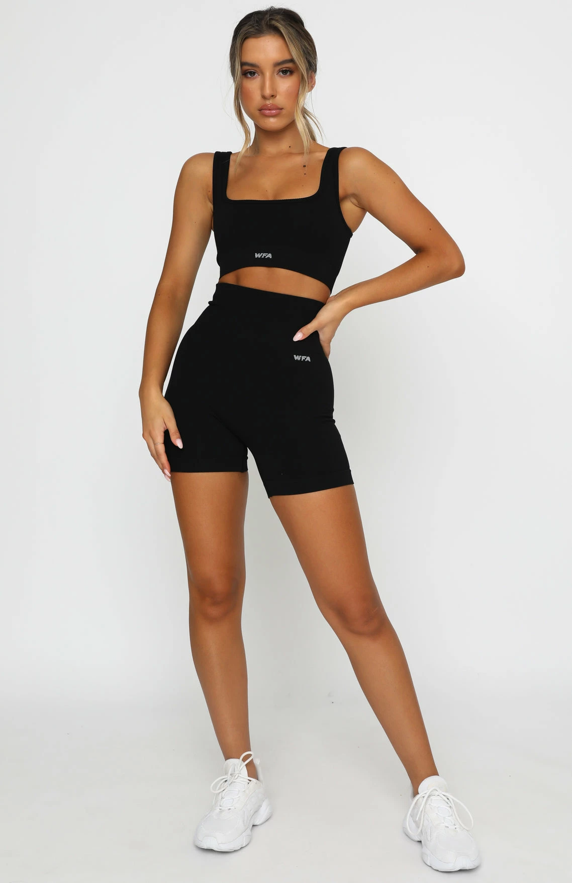 Have a killer workout in our Seamless High Waisted Shorts in Black. These bike shorts have a high wide flattering waistband, smooth flat lock seam detail, thick ribbed fabric and printed WFA logo front side and centre back waistband. Complete the matching set with either our Seamless Ribbed Sports Bra, Seamless Ribbed Long Sleeve Crop or Seamless Ribbed Sports Crop for a stand out gym look.