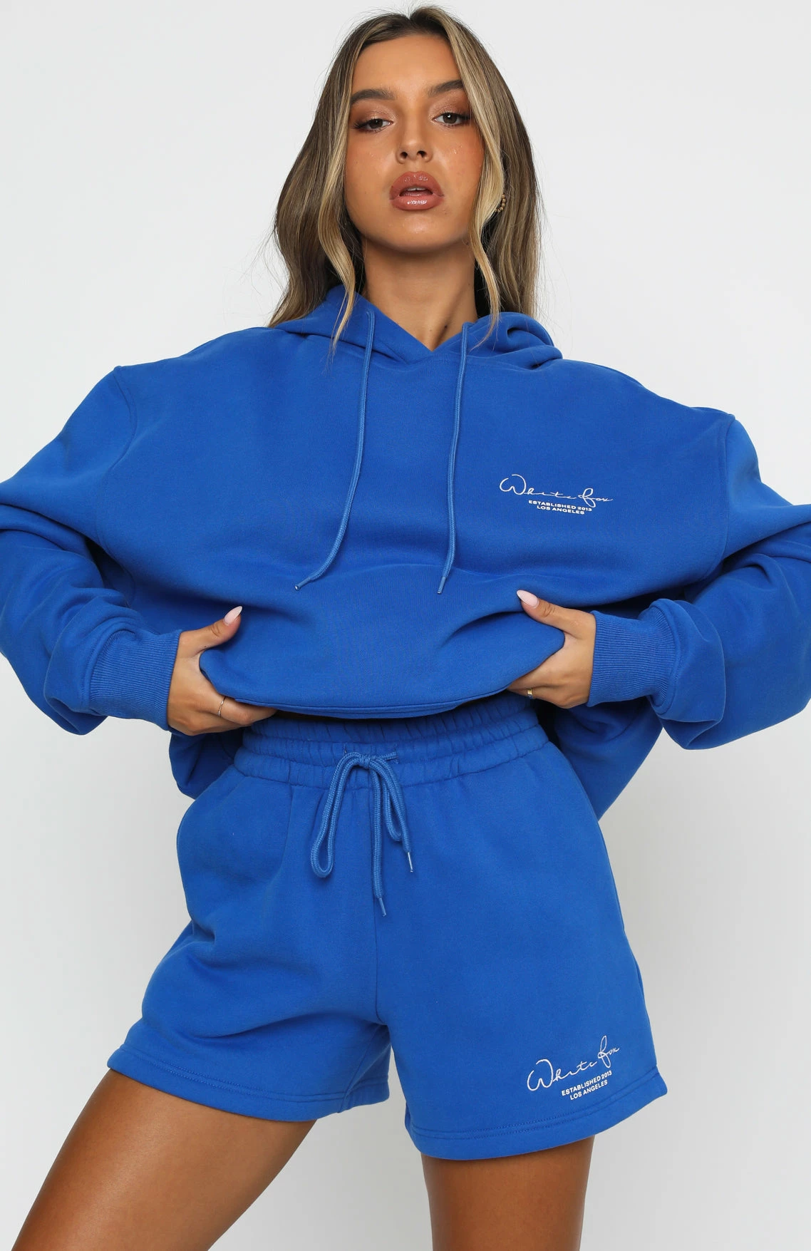 Add some colour to your loungewear wardrobe with our Set The Standard Hoodie in Electric Blue. This jumper is an oversized style with long sleeves, front hand pocket centre front, adjustable drawstring hood, super soft fleece fabric and embroidered and printed logo front side. Complete the matching set with our Check It Out Lounge Shorts or Still That Girl Sweatpants for a statement tracksuit look.