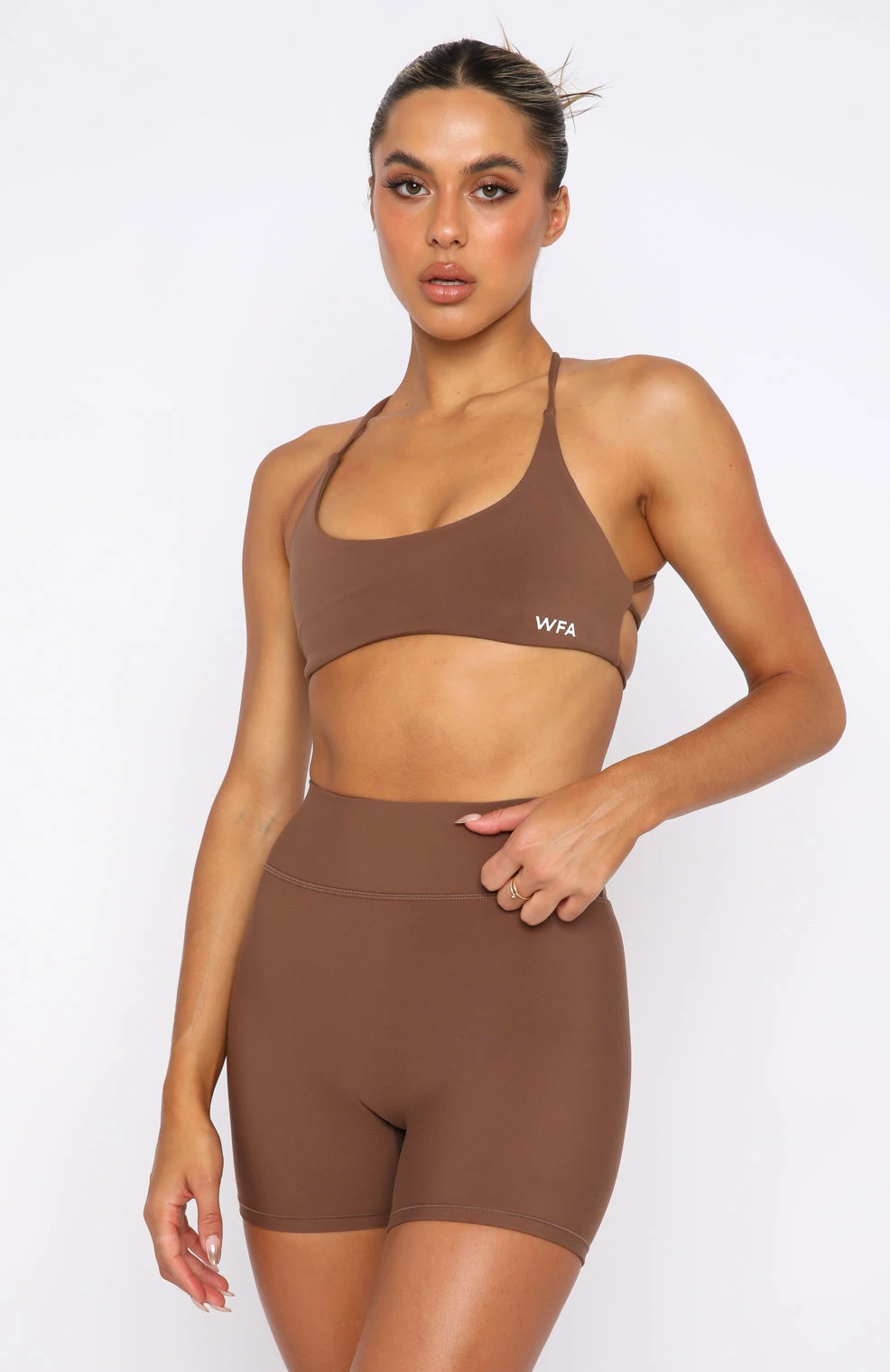 Elevate your gym-drobe with the She’s Healthy Sports Crop in Chocolate. Features scoop neckline, thin straps, fitted design, criss-cross back design, lined, removable padding and custom patch detail. Pair with one of the matching Go Getter High Waisted Leggings or Keep Up High Waisted Shorts for a look we are loving!