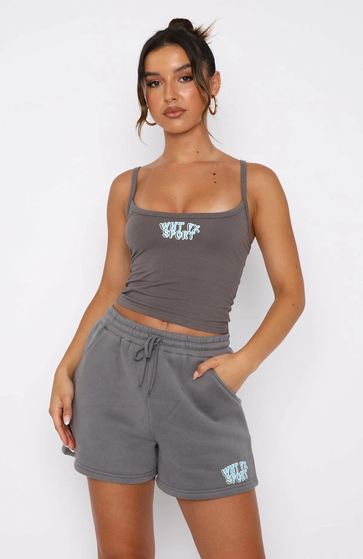 Comfort meets cool in the Sport Series Lounge Shorts in Charcoal. Featuring a loose relaxed fit with an elasticated high waistband with drawstring, side pockets, soft fleece fabric for extra comfort and printed logo front side. Pair with the matching Sport Series Zip Front Sweater or Sport Series Tank for the ultimate off-duty look!