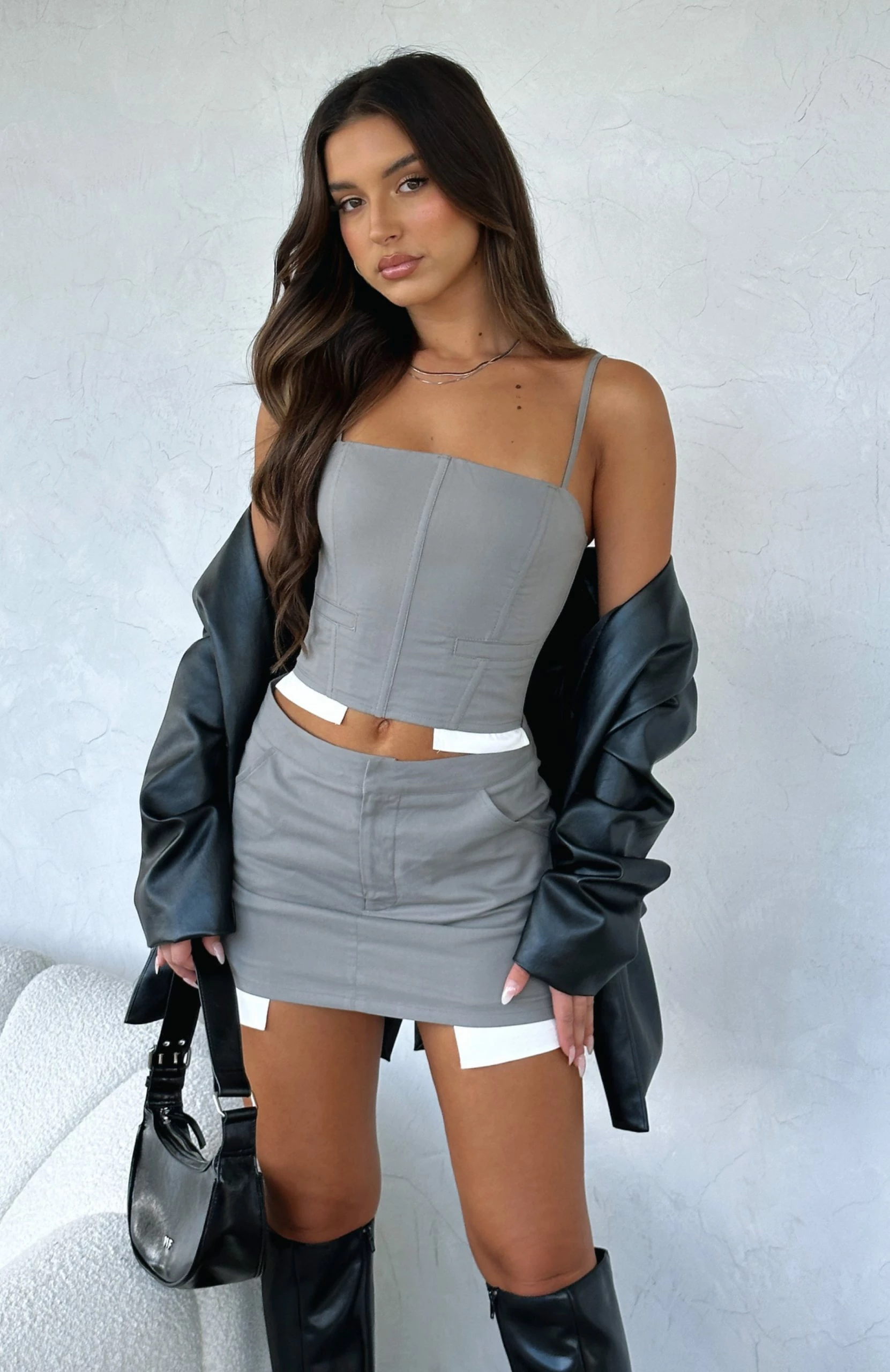 The set of your dreams is here! This Stay Forever Mini Skirt in Grey is high-waisted and features zipper and clasp closure, front pockets and lined fabric. Complete the set with the matching Mess It Up Bustier and platform slides for a combo we are obsessed with!