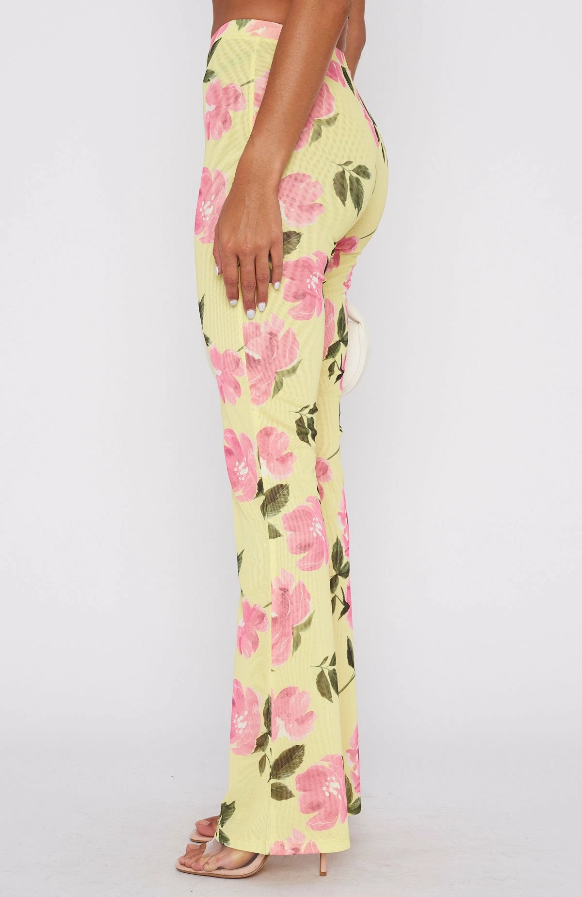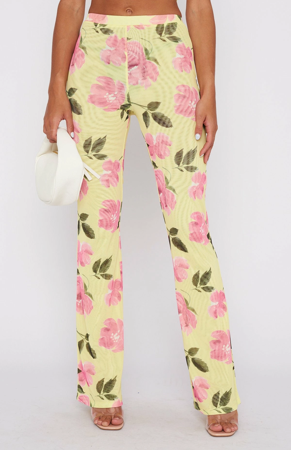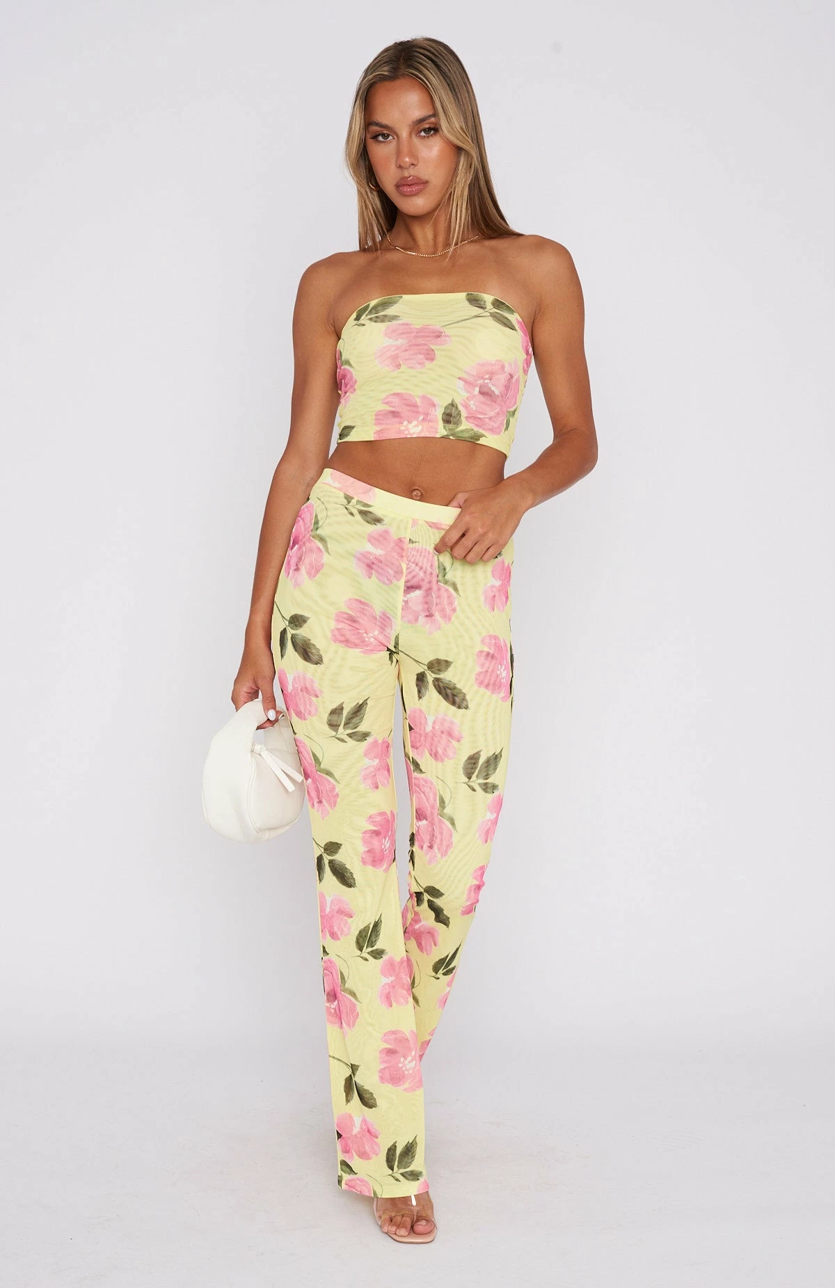You will be the moment in the Summer In The City Pants in Lemon Rose. These pants feature a high, elasticated waistband, lined, stretch mesh fabric and straight leg style.To complete the look pair with the matching Take Notice Strapless Crop and clear mules for a dreamy look!