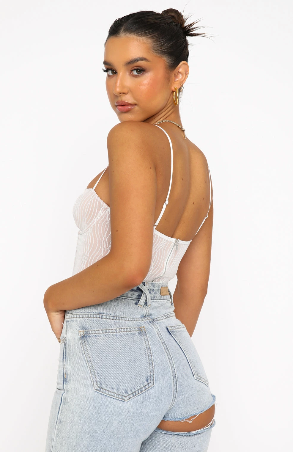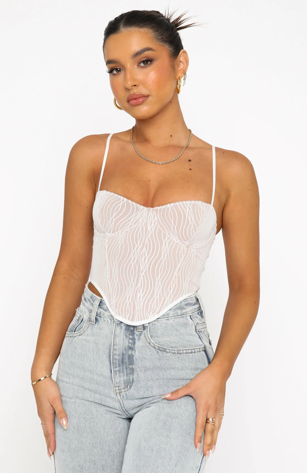 Elevate your date night wardrobe with the Take A Chance Bustier in White. Featuring thin, adjustable straps, bust underwire, boning in bodice, zipper centre back, curved edge and lined to avoid sheerness. Pair with leather pants and gold accessories for a look White Fox Angels love!