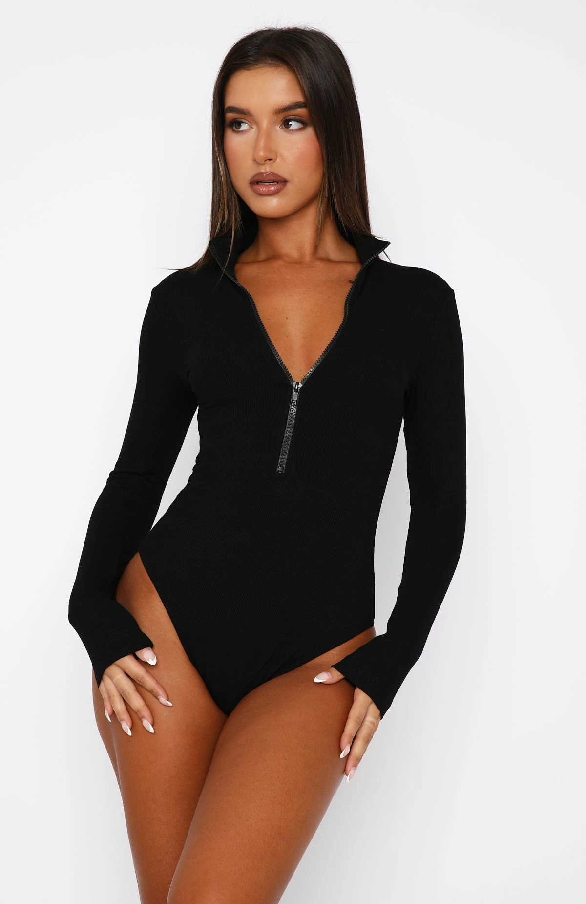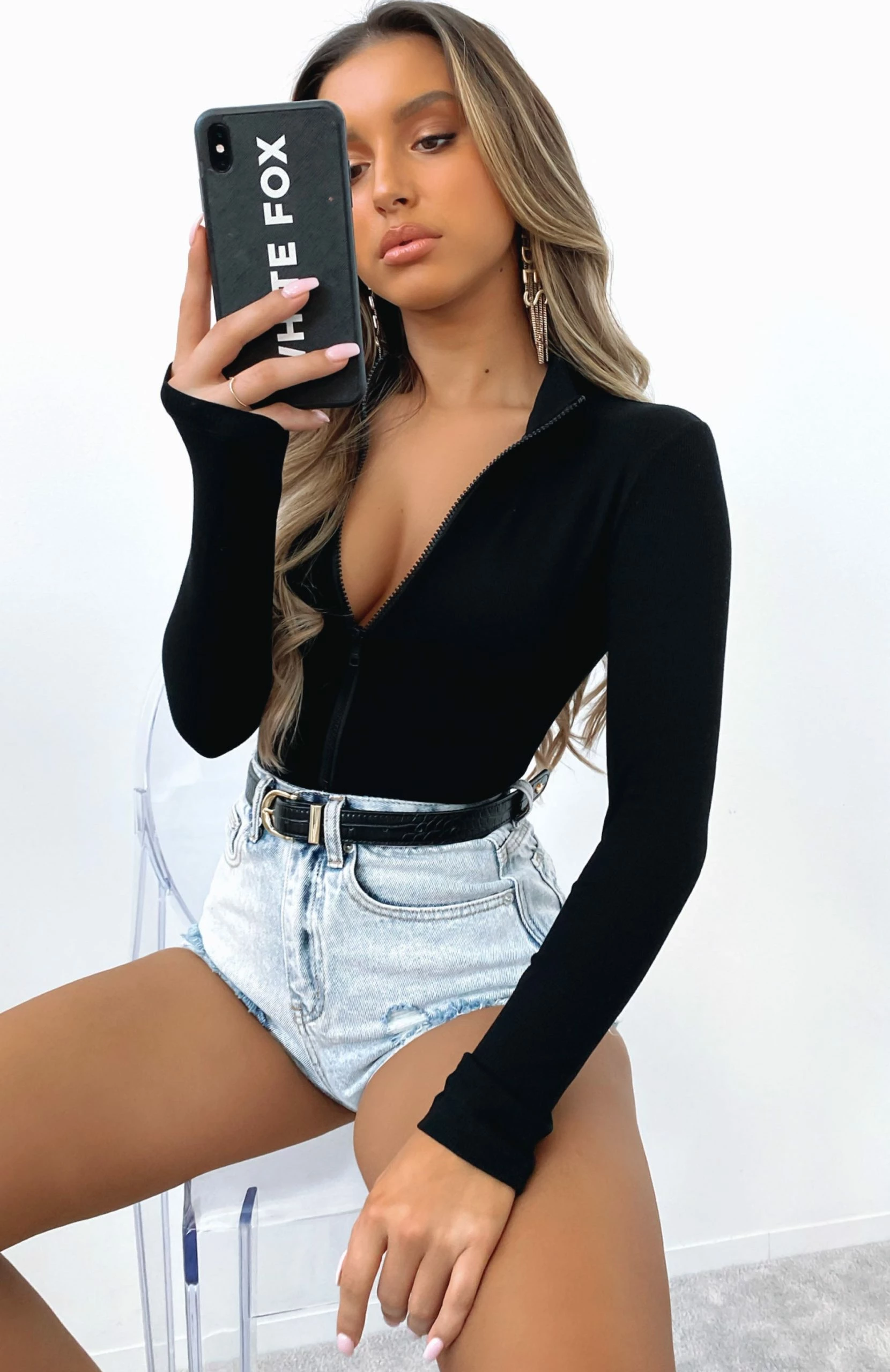 Your look just got a whole lot cooler in our Take A Walk Long Sleeve Bodysuit in Black. This long sleeve ribbed bodysuit has a black front zip, high neckline, cheeky cut design, snap closure at crotch, and stretch fabric. Complete the look with jeans and heels for an edgy date night look.