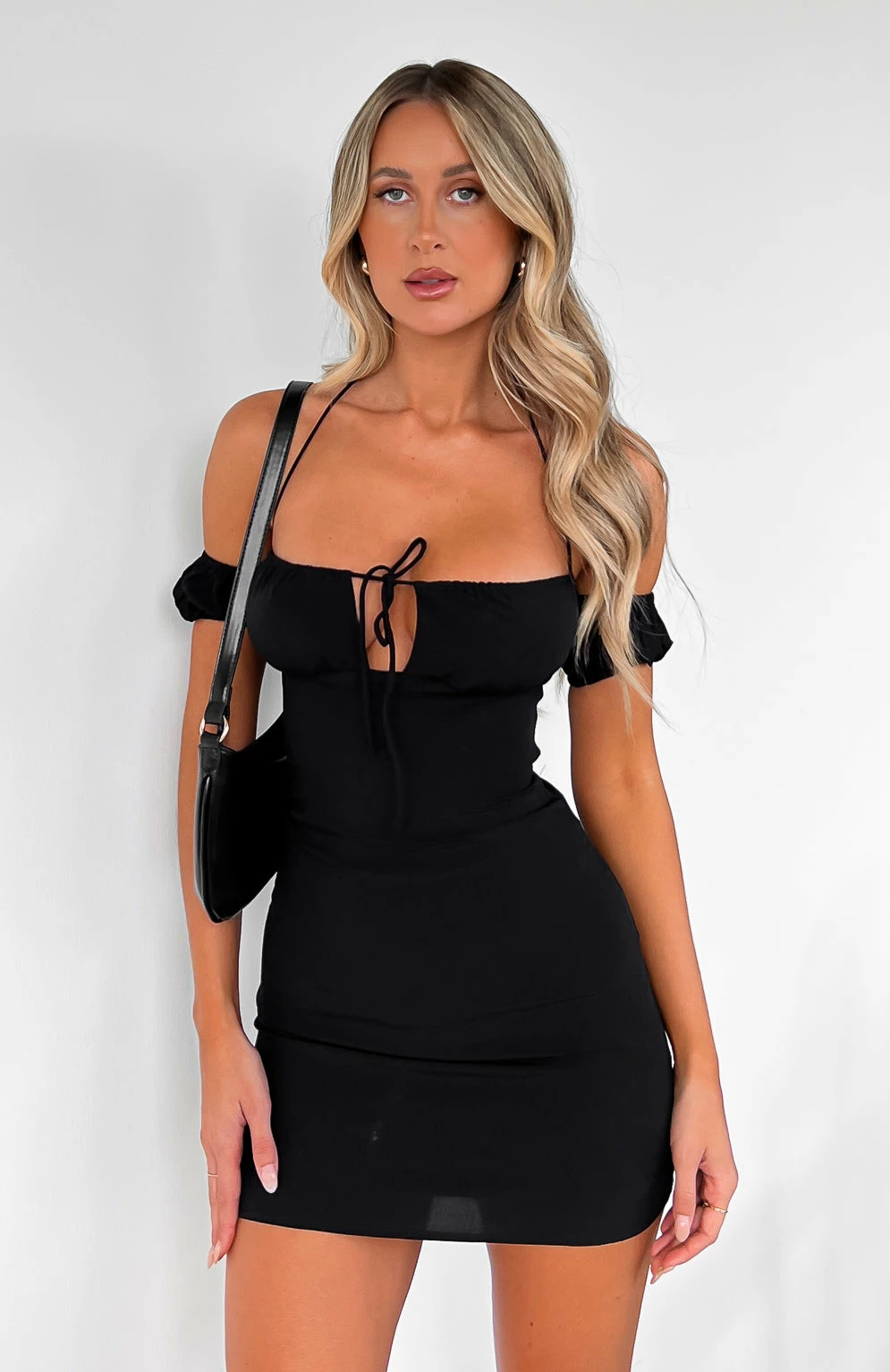 Get ready to wow in the Tea For Two Mini Dress in Black. Featuring halter neck style with tie design, straight neckline, off-the-shoulder design, key-hole design with tie detail, invisible zipper centre back and lined fabric. Pair with gold accessories and perspex heels for a look that will turn heads!
