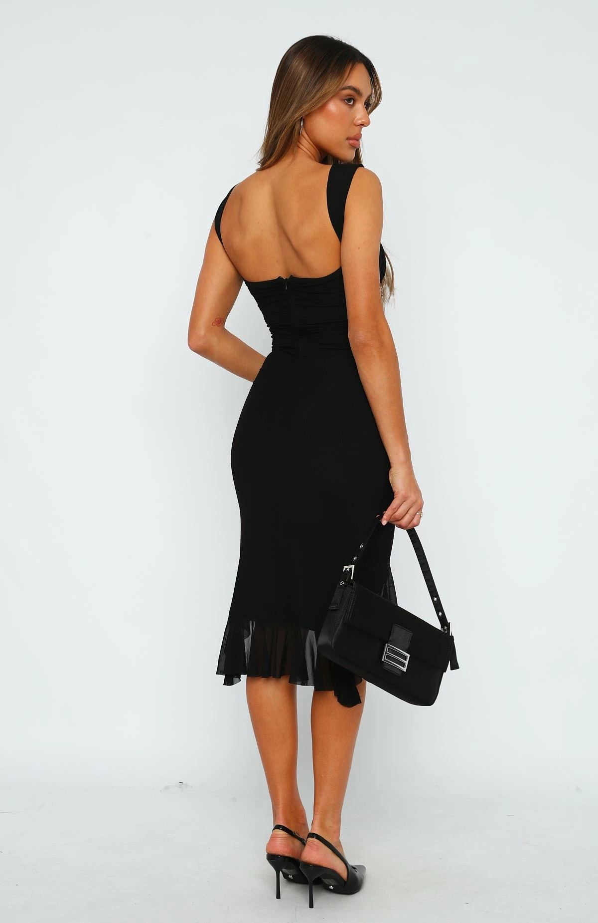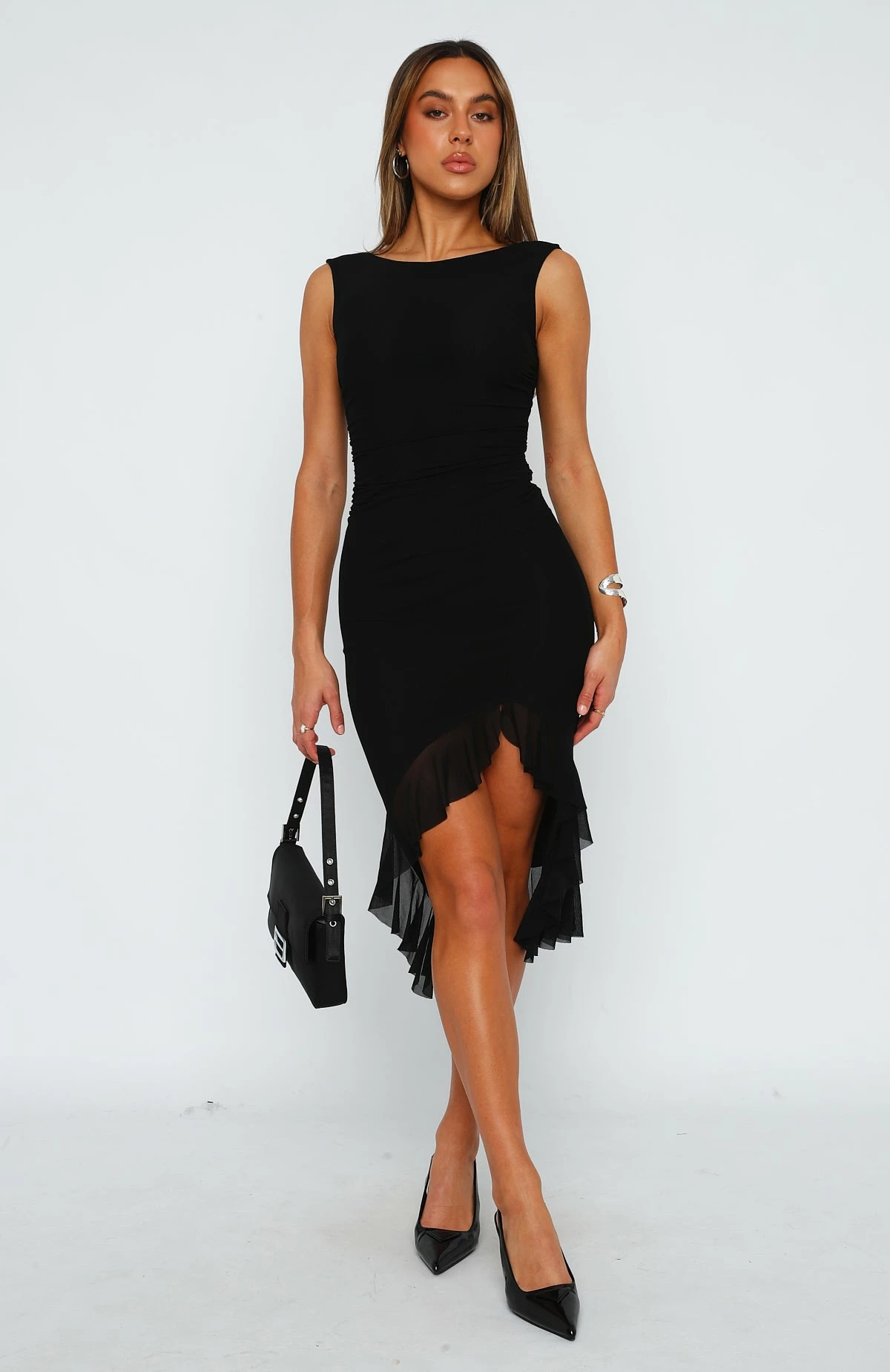 Bring a high-trend piece to your wardrobe with the The Way You Look Tonight Midi Dress Black. Features a ruffle hem detail, ruched side design, centre back hidden zipper, backless design, high neck fit and lined, mesh fabric. Complete the look with heels and gold accessories for a look that is sure to turn heads!