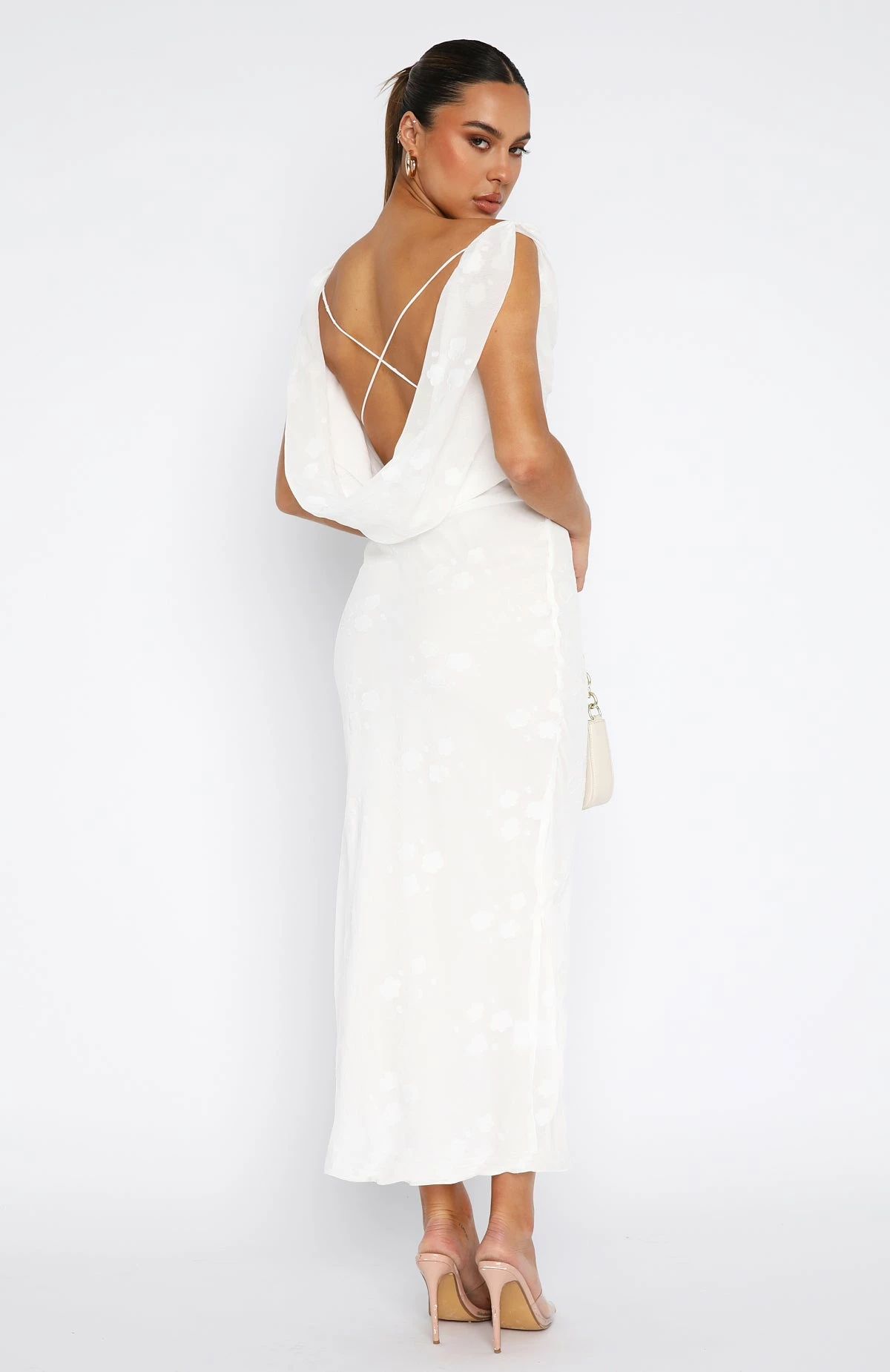 A flirty, fuss-free dress that still does all the talking, clingy in the right places and as comfortable as ever. The This Is The Year Maxi Dress White features a plunging neckline, slight off the shoulder fit, thin cross over straps at back, backless design, maxi length, high side split and lined, semi sheer fabric. Pair with subtle gold jewellery and mules for feminine and classy look!