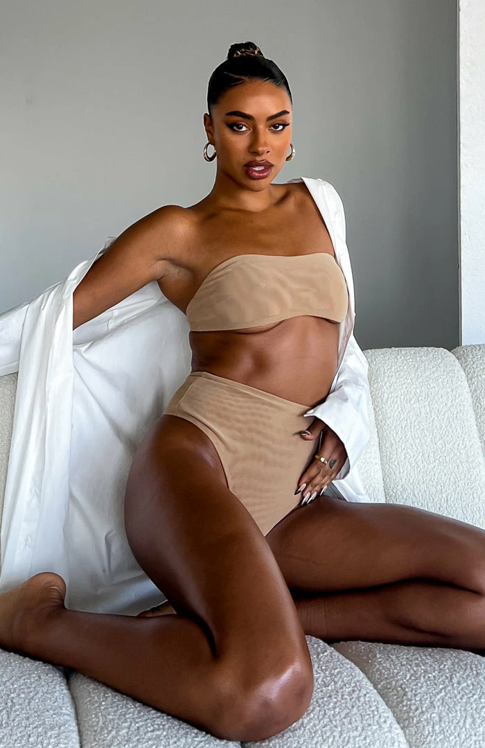 The Total Mood Mesh Hot Pants in Nude are essential in your intimates collection. This hot pants are high-waisted and features cheeky cut and lined, mesh fabric. These hot pants paired with the matching Secrets Out Mesh Bandeau Crop is perfect for styling under any mesh items, we are obsessed!