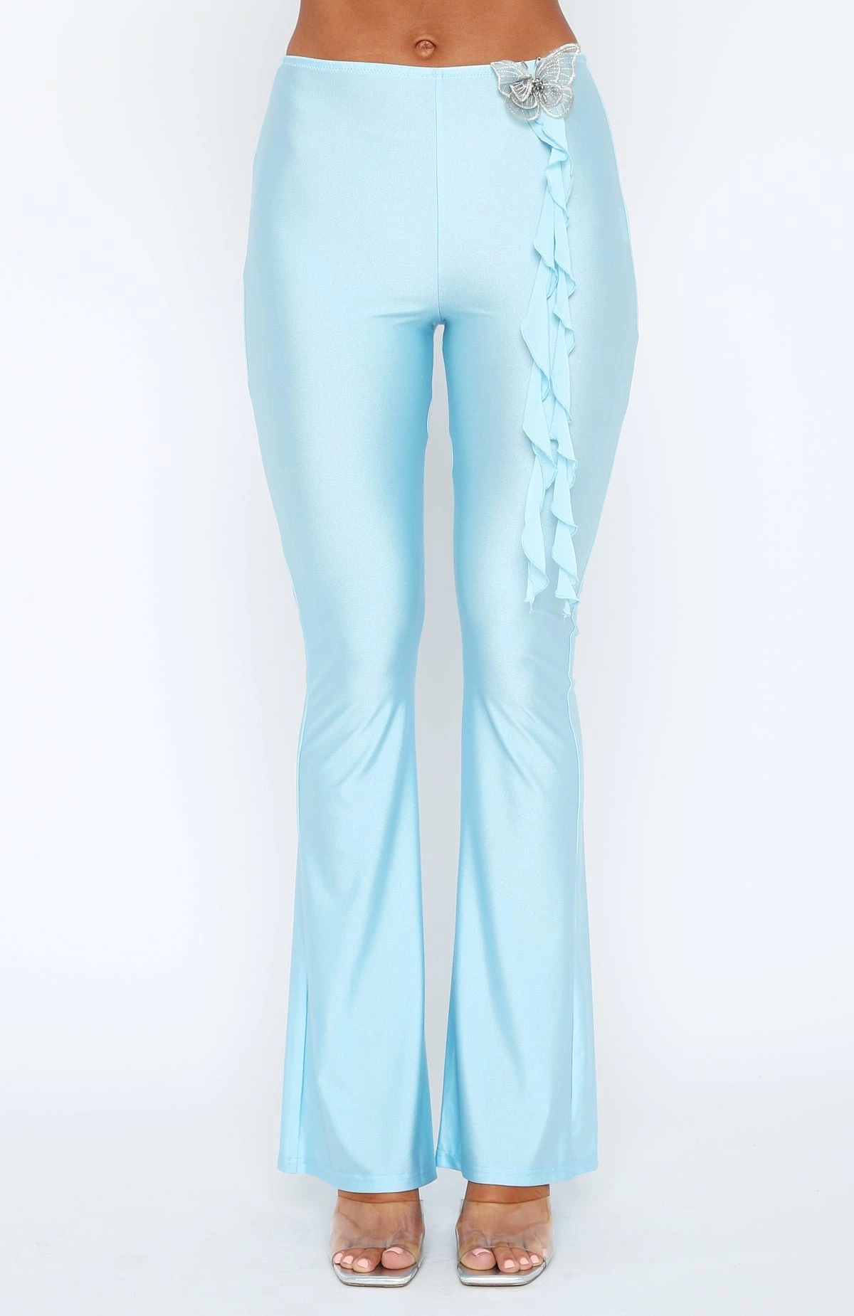 The Touch The Sky Pants in Baby Blue is giving the life of the party vibes! These pants are high-waisted and features grip tape, butterfly applique with stretch, flare legs and shimmer fabric. We love this paired with the matching Headlines Crop and platform slides for a show-stopping look!