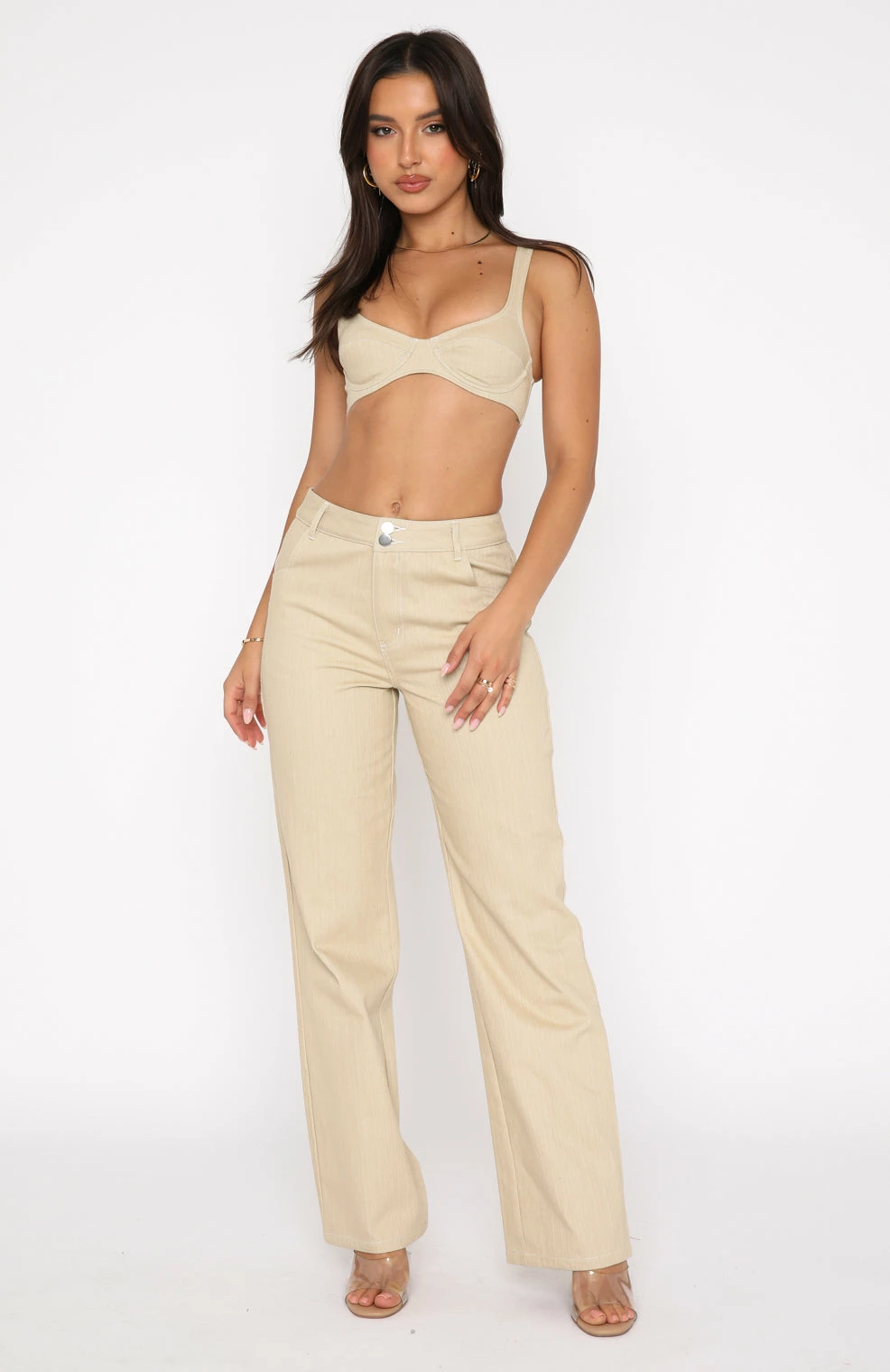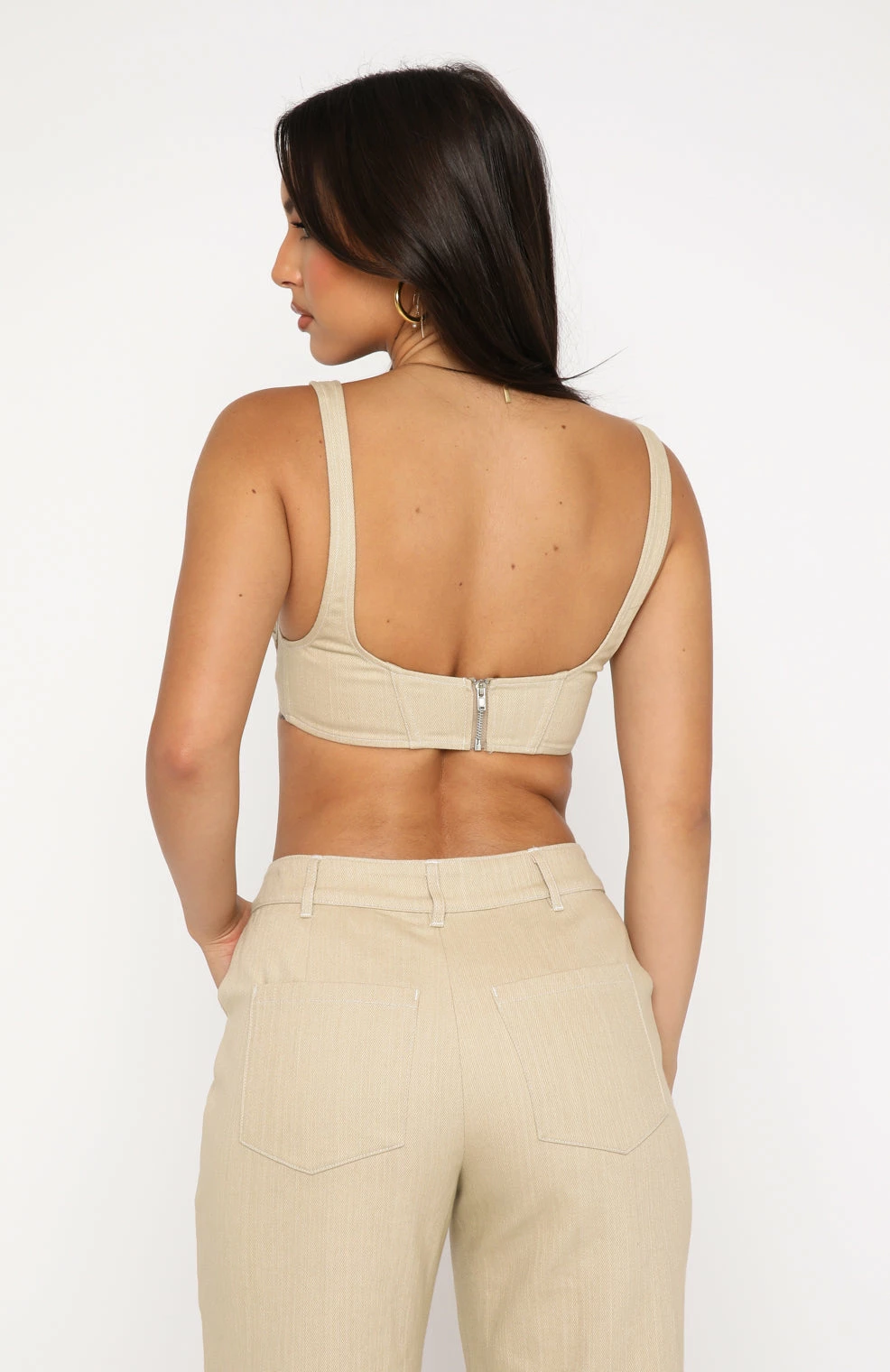 We are obsessing over this chic True For You Crop in Oatmeal. Featuring plunge neckline, bust underwire, lightweight denim fabric, centre back zipper and contrast stitching. Pair with the matching Power Play Pants and heels for a look White Fox Angels love.