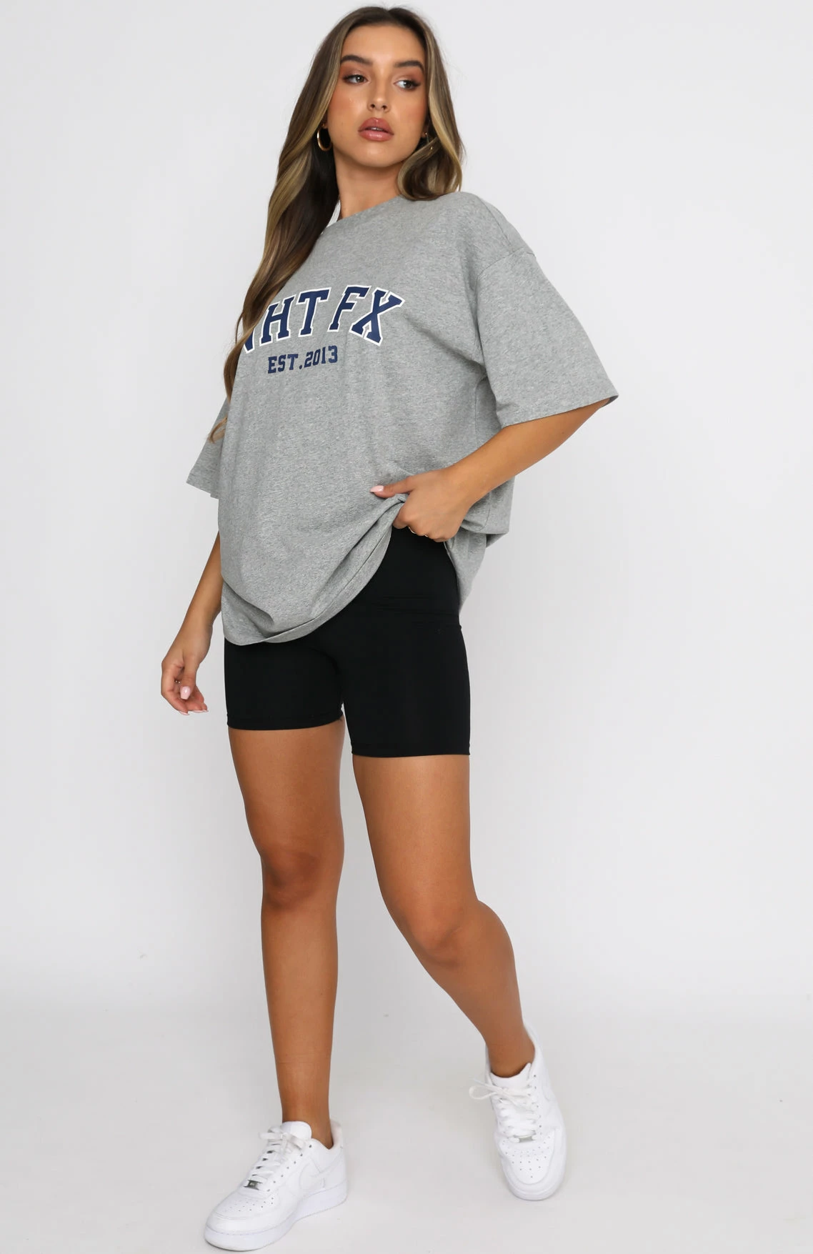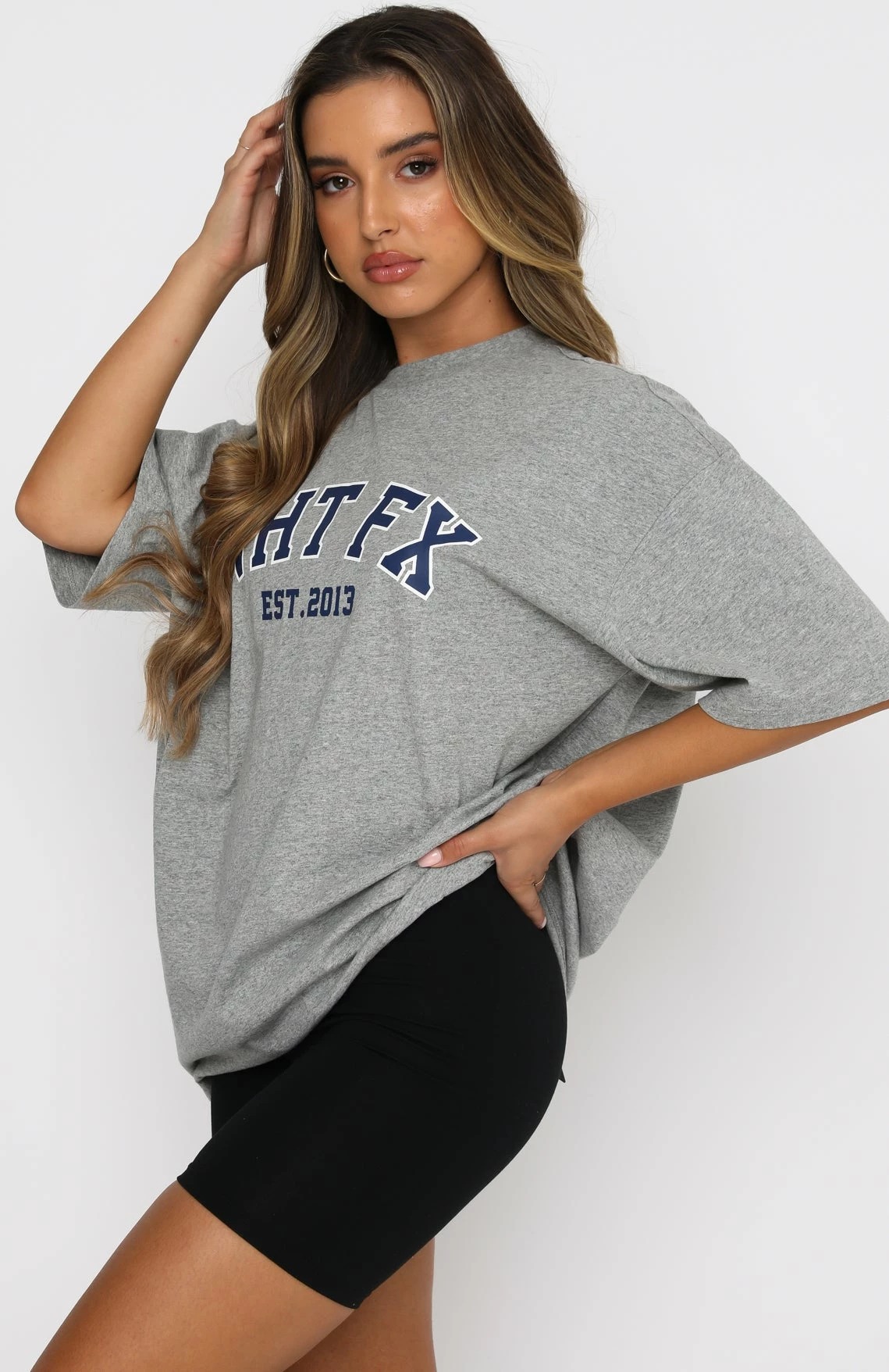 Style meets comfort in our Varsity Tee in Grey Marle. This oversized top has a high scooped neckline, slouch shoulders, and printed graphic centre front. Complete the look with bike shorts and sneakers for a seriously stylish outfit.