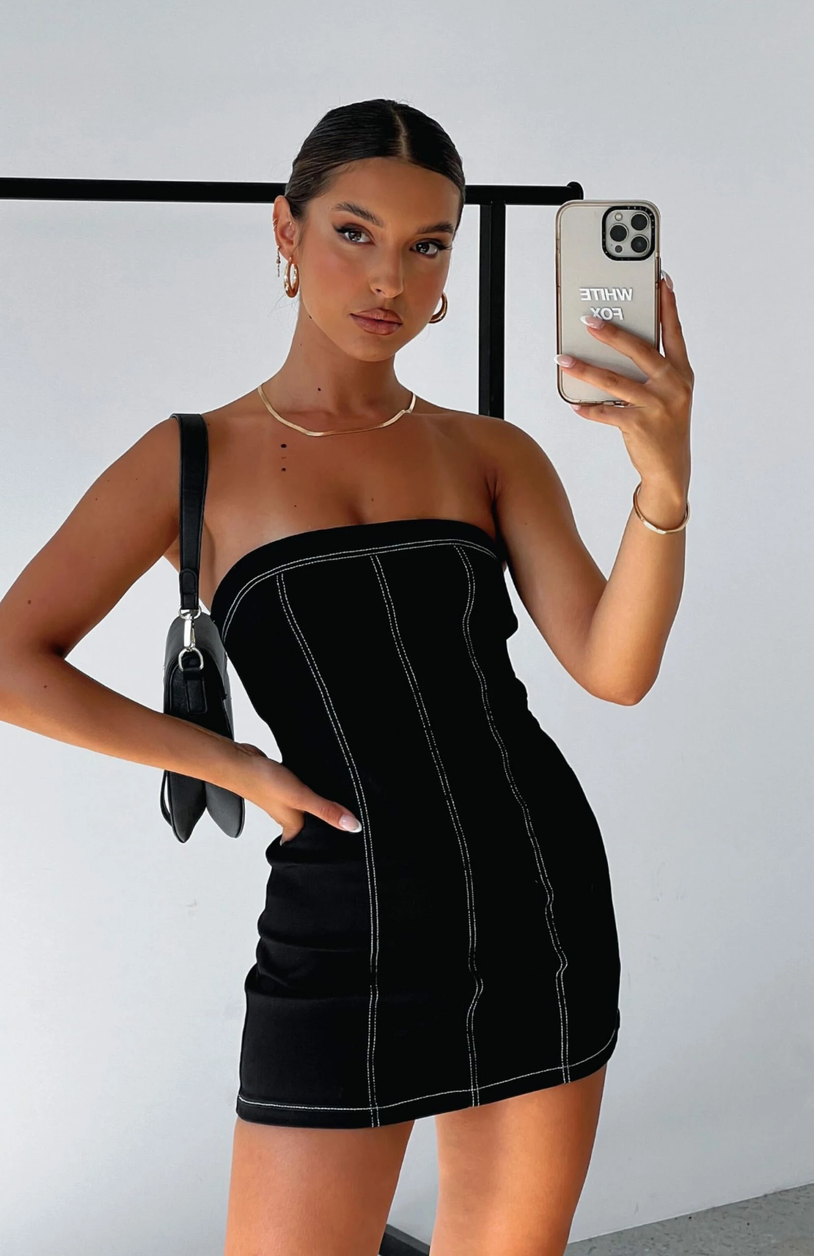 The Wandering Heart Strapless Mini Dress in Black is the definition of summer chic. Featuring a mini length, strapless, grip tape, invisible back zip closure and denim fabric. Pair with perspex heels and gold jewellery.