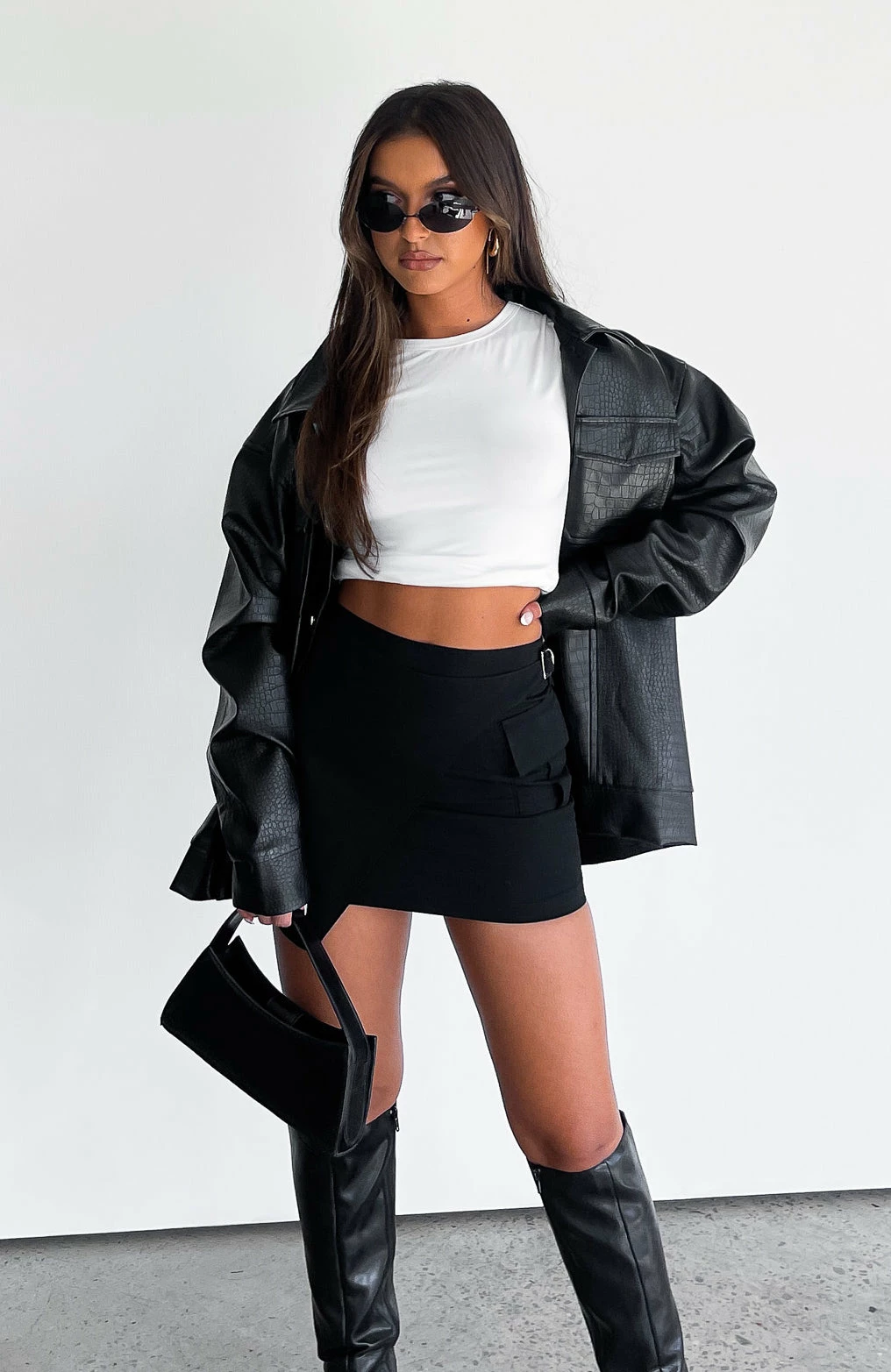 The Weekend Plans Mini Skirt in Black is a weekend staple! This mini skirt is low rise and features front pocket, invisible side zipper, wrap style design and lined fabric. We love this paired with a cute crop and platform slides for a dreamy look.