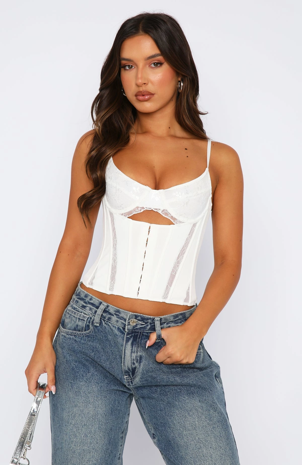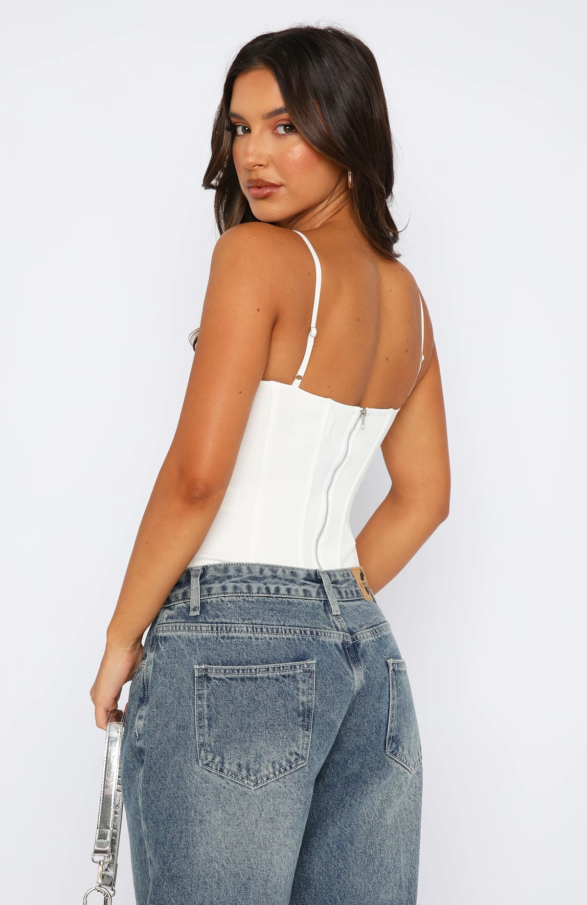 For extra glam vibes, the Whatever You Like Bustier White is a key piece for your wardrobe. Features thin adjustable straps, bust-cups and underwire, front cut-out design, boning in bodice, lace fabric detailing, front eyelet closure design, centre back zipper and mesh lined fabric. Pair with a mid rise jean and mini bag for a chic and elegant vibe!