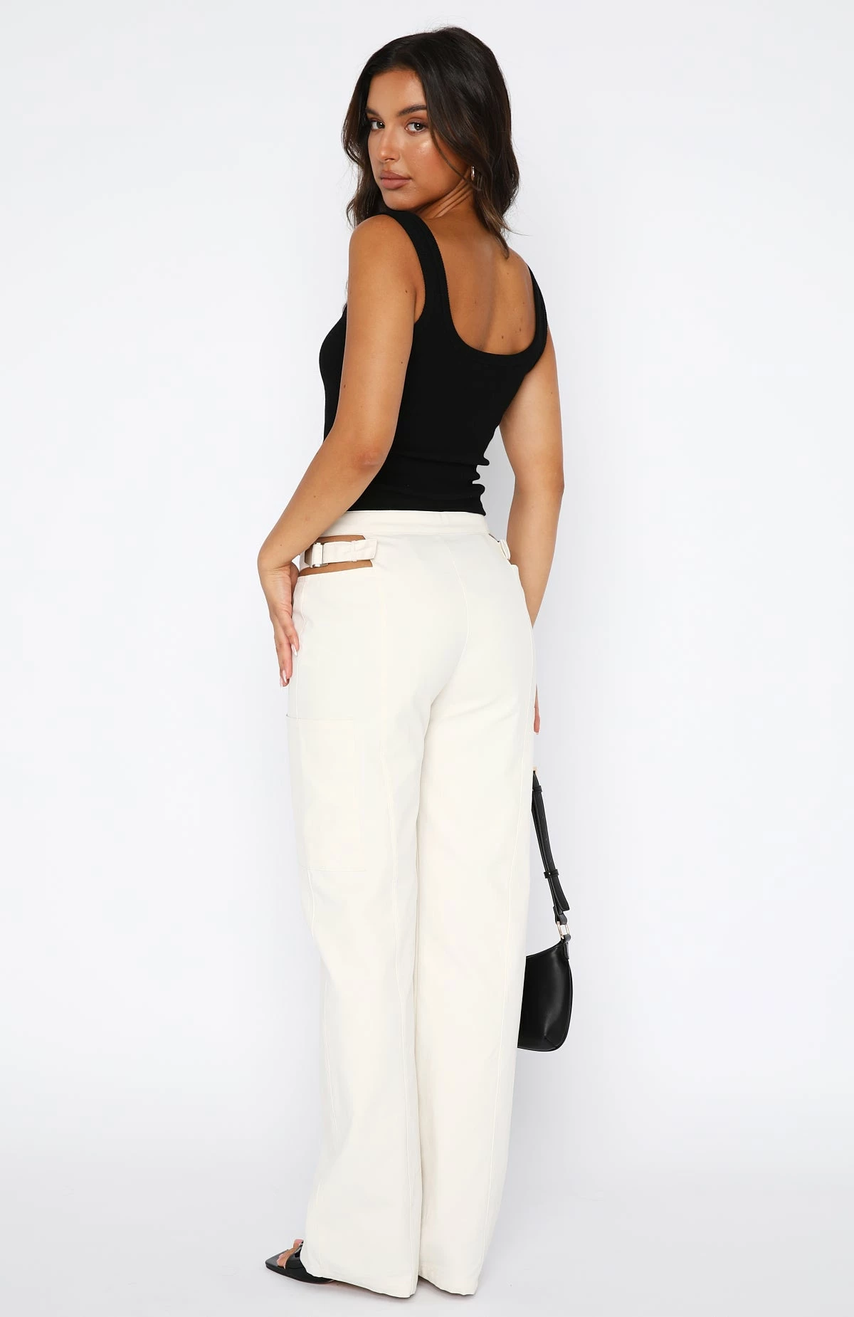 Whatever your style, find your latest pant in new, Grunge Girl. The While We’re Young Pants Cream feature a cargo design, wide leg fit, button/zip closure and pocket design on legs, cut-out side design with adjustable buckle design and unlined fabric. We love this paired with a bustier and sneakers for the ultimate cool girl look!