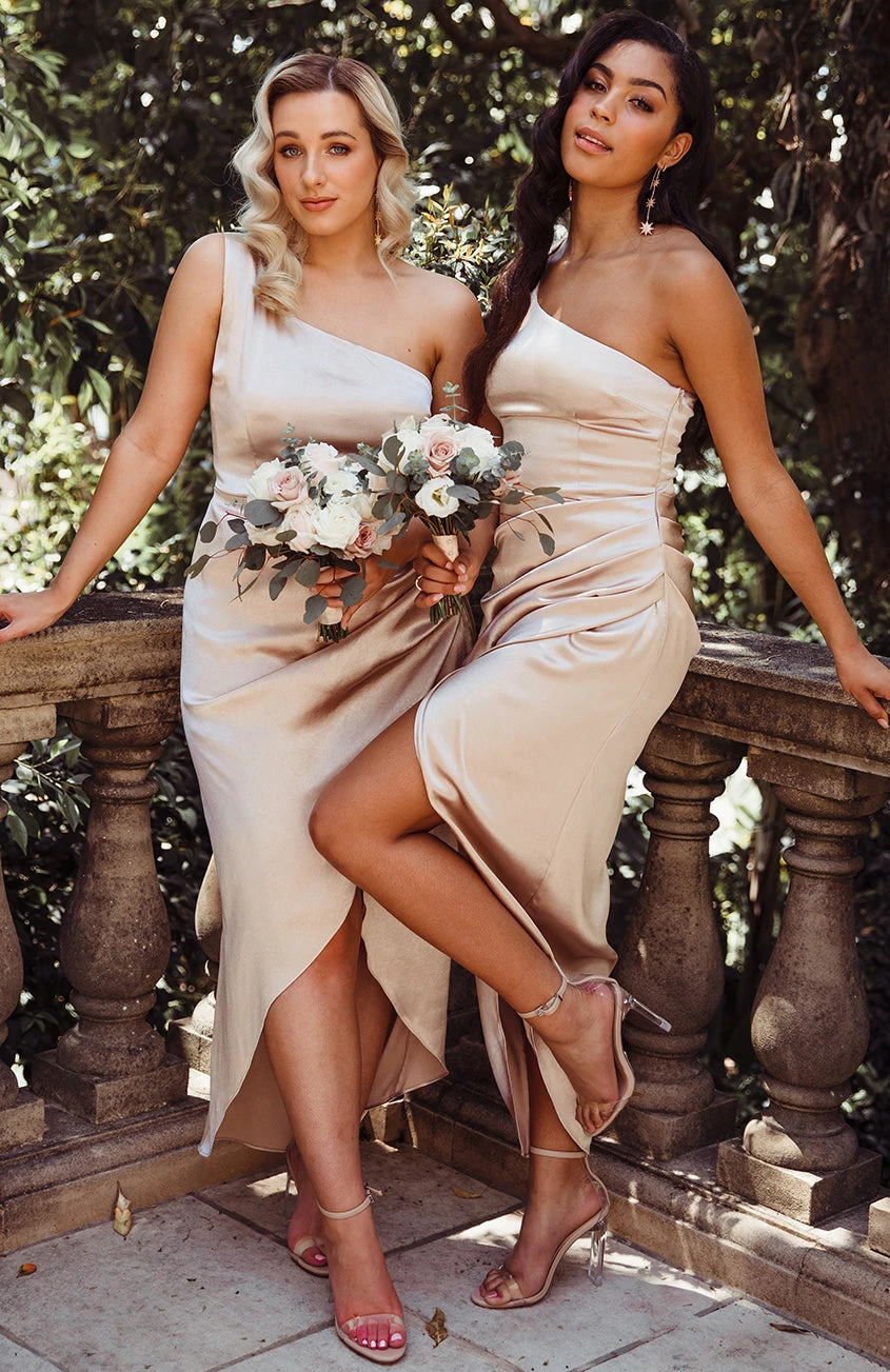 Stand out at your next event in the Willow Wrap Dress in Champagne. This satin wrap style dress has a one shoulder design, high low hem, side gathering detail in skirt, invisible side zip, and is lined at bust. Perfect choice as a bridesmaid or guest outfit paired with heels and gold jewellery.