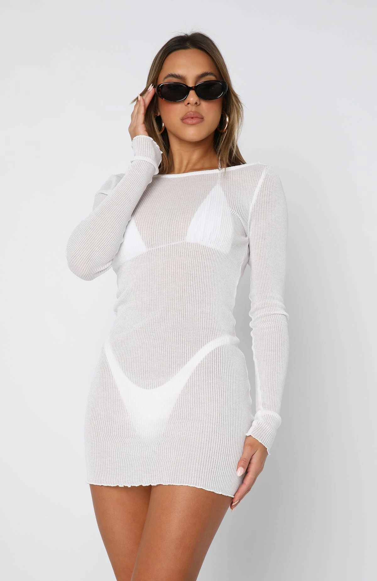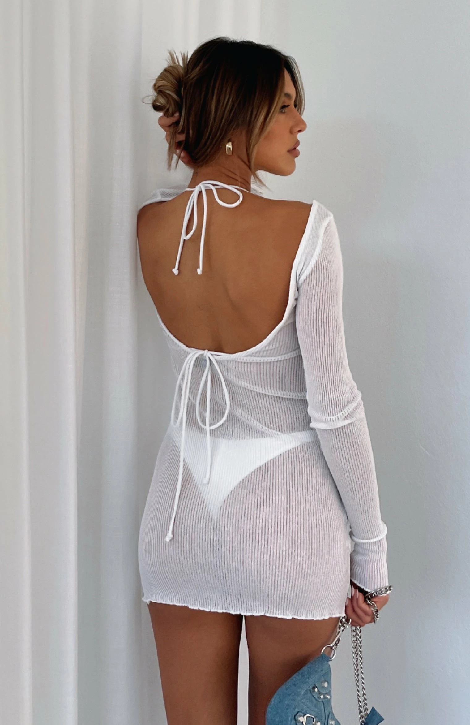 Show off your glow with this Without Warning Long Sleeve Mini Dress White. Features a backless design, lettuce hem, long sleeves and sheer, lightweight fabric. Pair over your favourite White Fox Bikini and platform slides to level up the look!